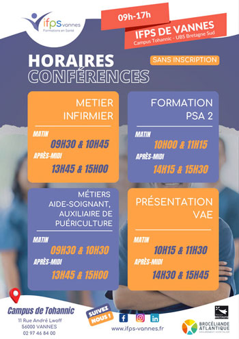 À l’occasion des Journées Portes Ouvertes, IFPS de Vannes vous propose une série de conférences et temps d’échange, accessibles sans inscription, tout au long de la journée.
